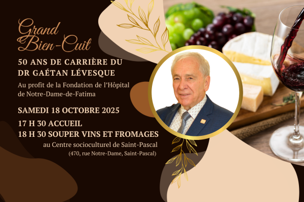La Fondation de l’Hôpital de Notre-Dame-de-Fatima est heureuse de vous convier à un Grand Bien-Cuit pour souligner les 50 ans de carrière de son président, le Docteur Gaétan Lévesque. Cet événement, au profit de la Fondation, aura lieu le samedi 18 octobre 2025, au Centre socioculturel de Saint-Pascal.